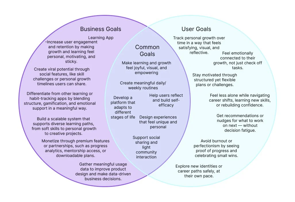 What emerged instead was a clear desire for learning that felt more like daily self-care than academic obligation. Participants gravitated toward the idea of flexible tracks aligned with personal goals—"Creative Confidence" or "Level Up at Work"—that could provide structure without rigidity. Most telling was their relationship with progress itself: users cared less about mastering content and more about maintaining forward momentum, finding visual progress indicators and streak systems genuinely motivating. The social element proved equally nuanced—while some craved optional accountability and shared challenges, others preferred solo learning without pressure, revealing the need for a solution that could gracefully support both learning styles.